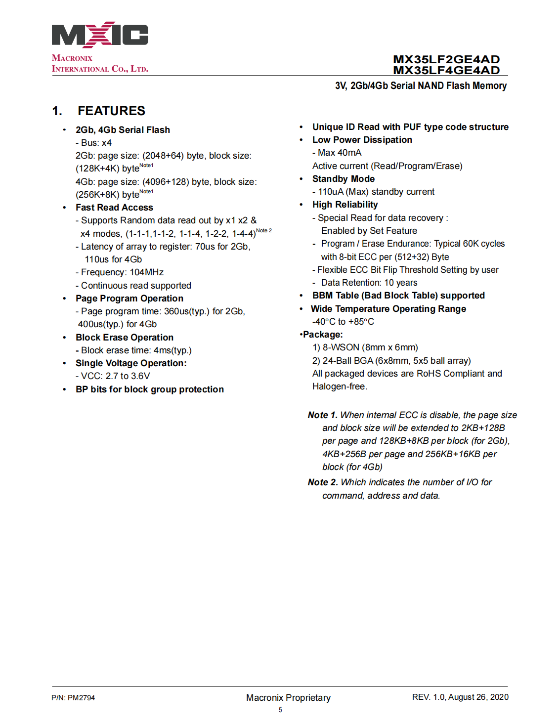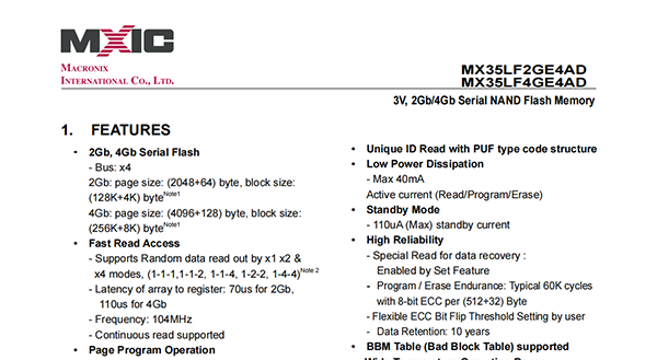 The MX35LFxGE4AD is a 3V 2Gb/4Gb SLC NAND Flash memory device with Serial interface.