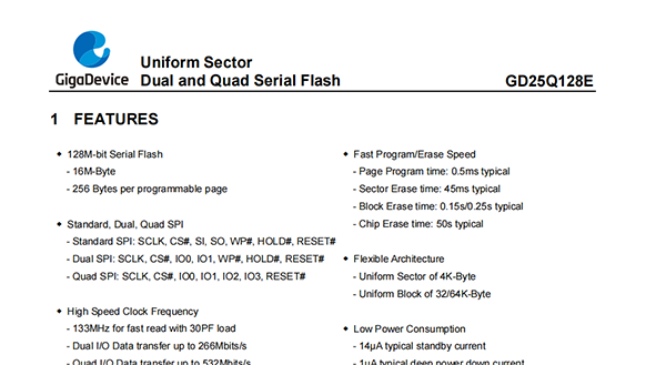 The GD25Q128E (128M-bit) Serial flash supports the standard Serial Peripheral Interface (SPI), and the Dual/Quad SPI: