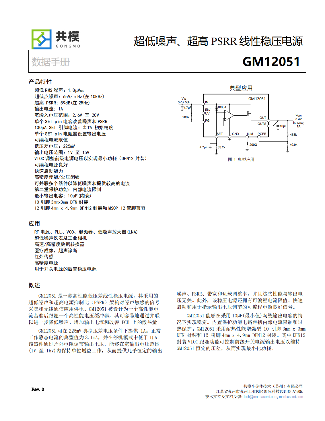 GM12051是一款高性能低壓差線性穩(wěn)壓電源,其采用的超低噪聲和超高電源抑制比(PSRR)架構(gòu)對(duì)噪聲敏感的信號(hào)采集和無(wú)線通信應(yīng)用供電。GM12051被設(shè)計(jì)為一個(gè)高性能電流基準(zhǔn)后跟隨一個(gè)高性能電壓緩沖器,其可容易地通過(guò)并聯(lián)以進(jìn)一步降低噪聲、增加輸出電流和改善PCB上的散熱量。