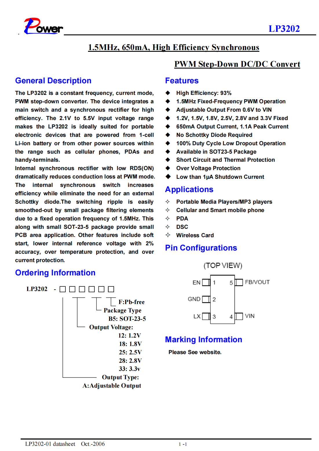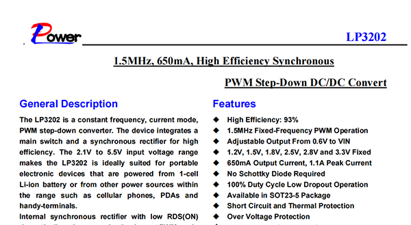 The LP3202 is a constant frequency,current mode,PWM step-down converter.The device integrates a main switch and a synchronous rectifier for high efficiency.The 2.1V to 5.5V input voltage range makes the LP3202 is ideally suited for portable electronic devices that are powered from 1-cell Li-ion battery or from other power sources within the range such as cellular phones,PDAs and handy-terminals.Internal synchronous rectifier with low RDS(ON)dramatically reduces conduction loss at PWM mode.