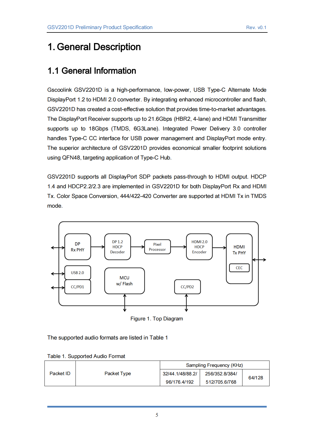 The superior architecture of GSV2201D provides economical smaller footprint solutionsusing QFN48,targeting application of Type-C Hub.GSV2201D supports all DisplayPort SDP packets pass-through to HDMI output.HDCP 1.4 and HDCP2.2/2.3 are implemented in GSV2201D for both DisplayPort Rx and HDMI Tx.Color Space Conversion,444/422-420 Converter are supported at HDMI Tx in TMDS mode.