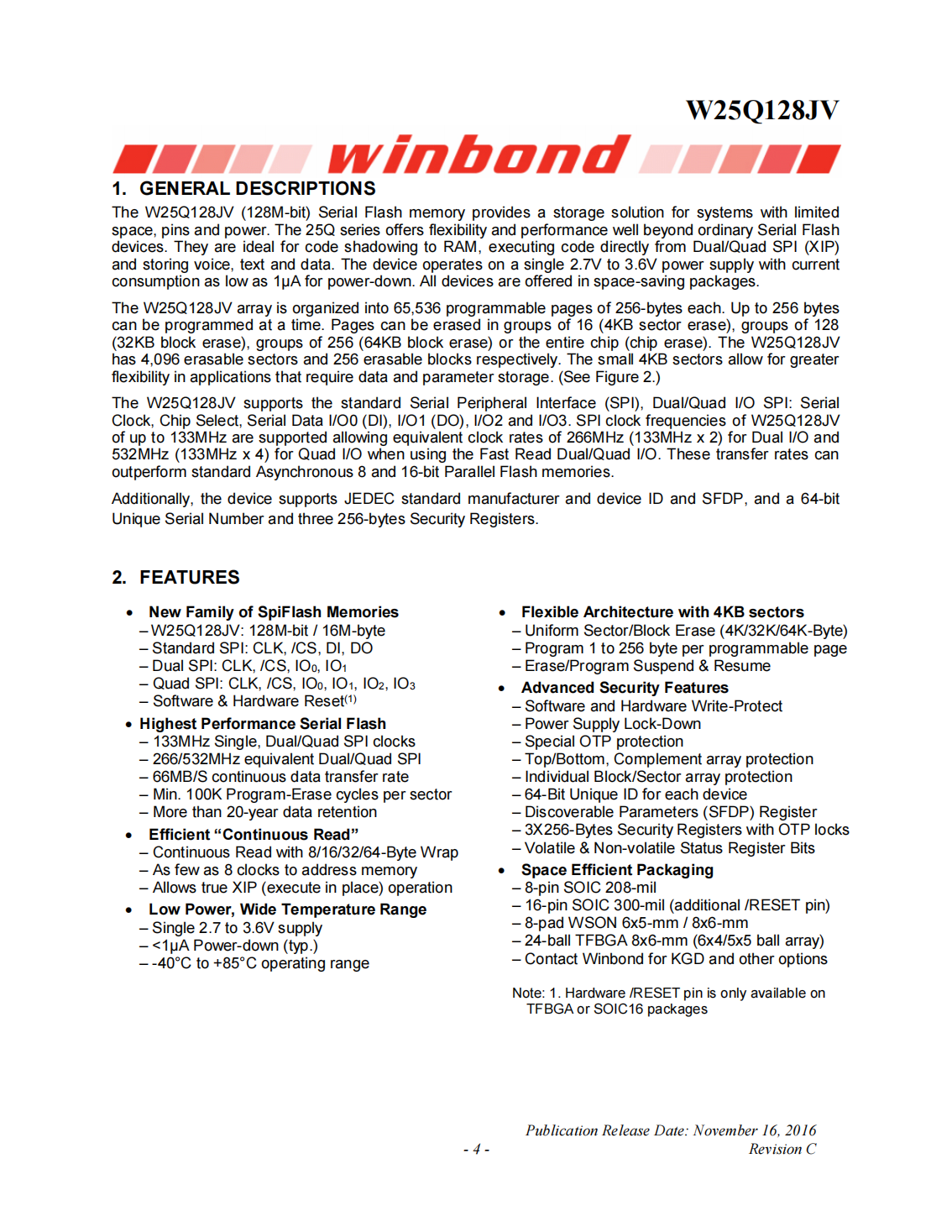The W25Q128JV(128M-bit)Serial Flash memory provides a storage solution for systems with limited space,pins and power.The 25Q series offers flexibility and performance well beyond ordinary Serial Flash devices.They are ideal for code shadowing to RAM,executing code directly from Dual/Quad SPI(XIP)and storing voice,text and data.The device operates on a single 2.7V to 3.6V power supply with current consumption as low as 1μA for power-down.All devices are offered in space-saving packages.