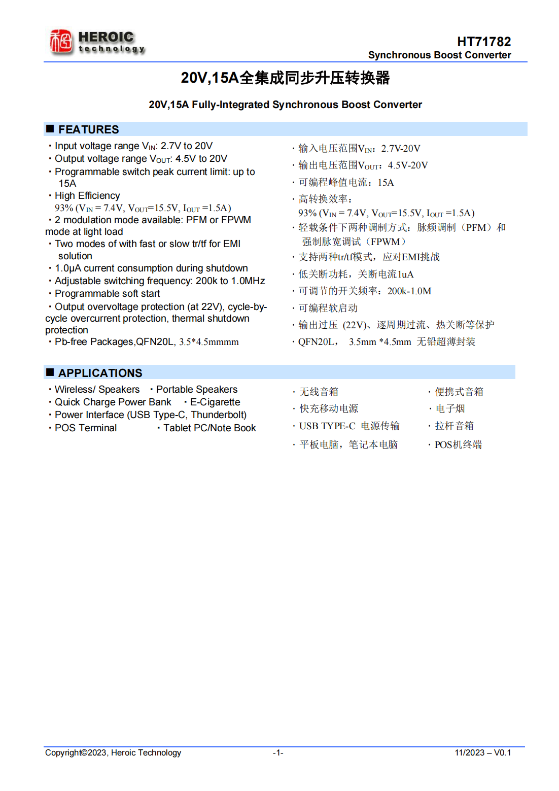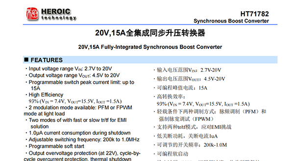 HT71782具有2.7V至20V寬輸入電壓范圍,可為采用單節(jié)或兩節(jié)鋰電池的應(yīng)用提供支持。該器件具備15A開關(guān)電流能力,并且能夠提供20V的輸出電壓。