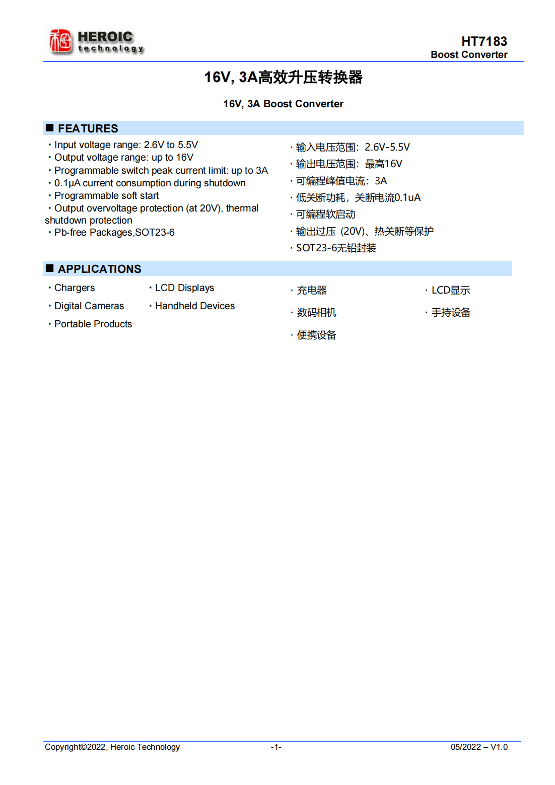 HT7183是一款高功率異步升壓轉(zhuǎn)換器,集成 120mΩ功率開關(guān)管,為便攜式系統(tǒng)提供高效的 小尺寸解決方案