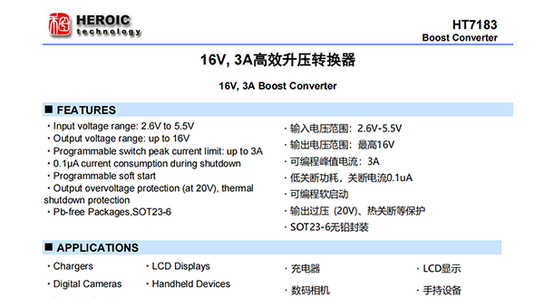 HT7183具有2.6V至5.5V輸入電壓范圍,可為各類不同供電的應(yīng)用提供支持。該器件具備3A開關(guān)電流能力,并且能夠提供高達16V的輸出電壓。