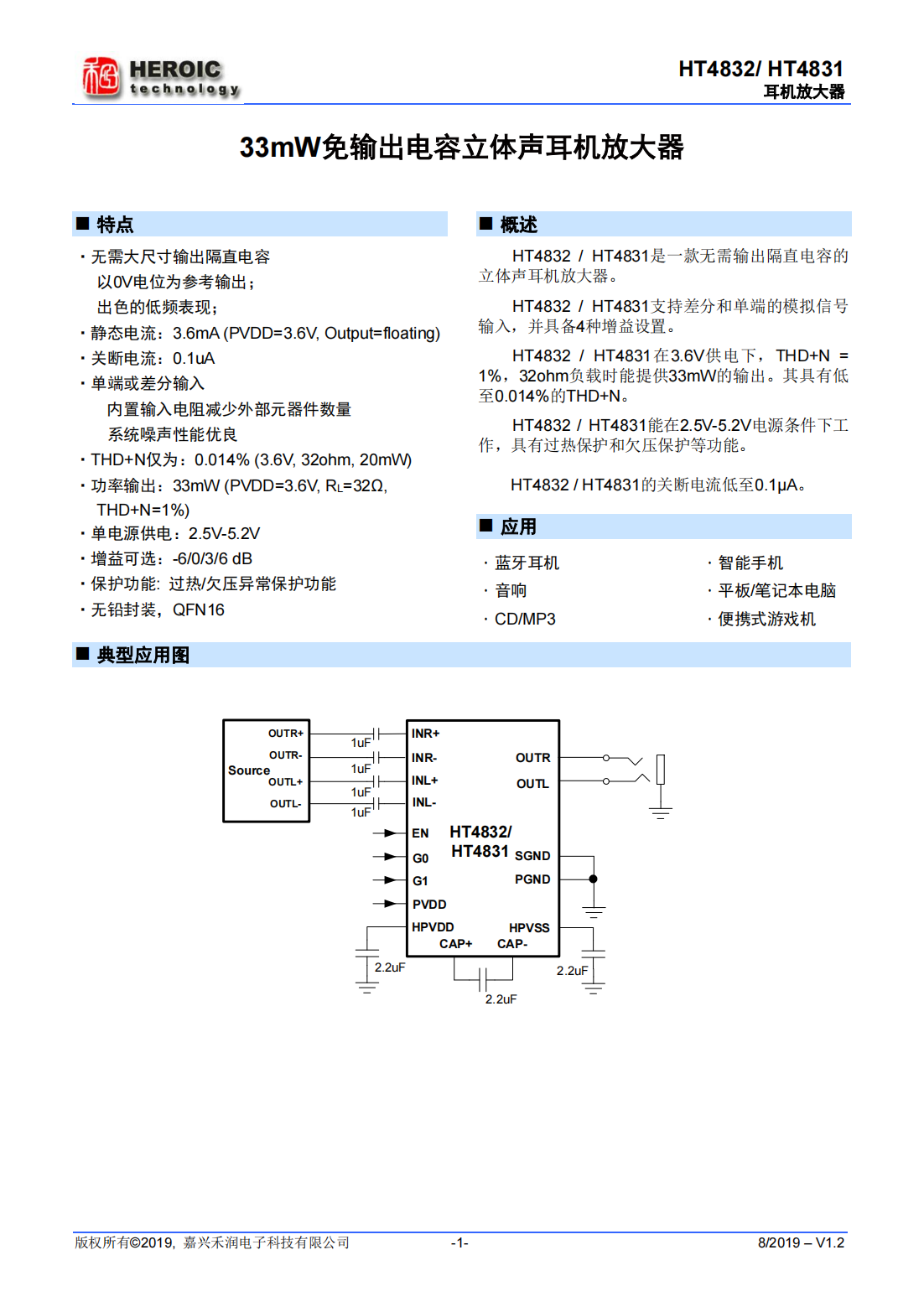 HT4832/HT4831是一款無需輸出隔直電容的立體聲耳機放大器。