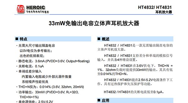HT4832/HT4831在3.6V供電下,THD+N=1%,32ohm負載時能提供33mW的輸出。其具有低至0.014%的THD+N。