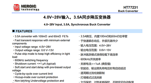 HT77231是一款3.5A降壓轉(zhuǎn)換器,具有最少的外部元件和低關(guān)斷電流。該器件具有快速瞬態(tài)響應(yīng)的特點(diǎn),輸出電容器采用低ESR(聚合物)或超低ESR(陶瓷),無需外部補(bǔ)償。該器件在輕載時(shí)以脈沖跳躍模式工作,達(dá)到高效。