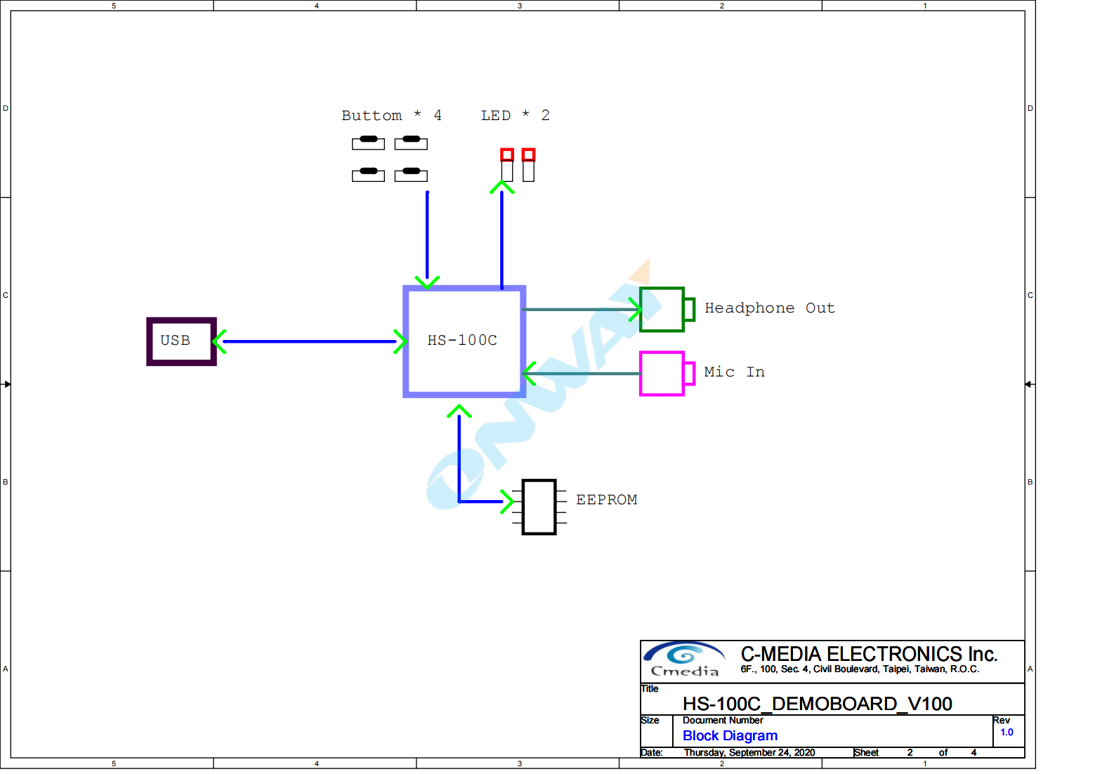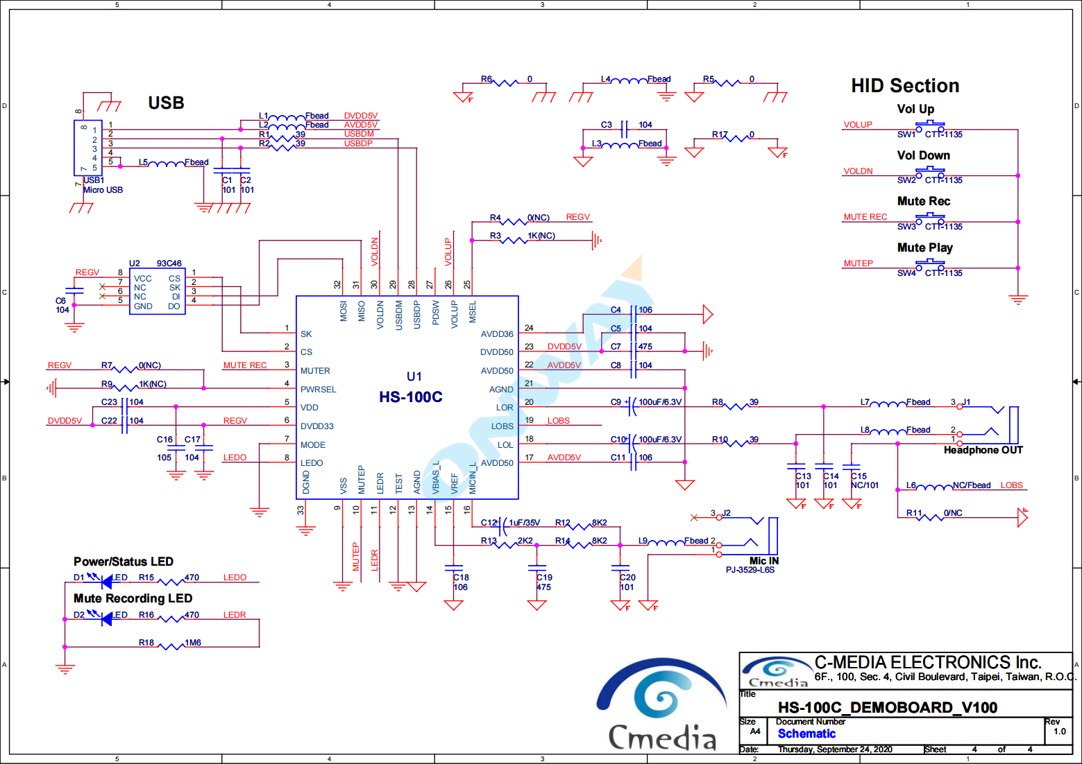The HS-100C is a highly-integrated,crystal-free USB audio single chip solution optimized typically for USB headset,headphone,and dongle(wireless adapter enabled)applications.All necessary analog and digital modules were embedded in the HS-100C,including stereo DAC and earphone driver;mono ADC;microphone pre-amp booster;PLL;regulator;and USB transceiver.Many features of the HS-100C are programmable with jumper pins or external EEPROM.Customers can customize unique USB VID/PID/Product String/Manufacture String and max/min/initial volume settings via an external EEPROM.In addition,the HS-100C supports HID compliant volume control pins such as Playback Mute,Volume Up/Down and a Record Mute pin which interacts with the playback operation LED and record mute LED control pins.The HS-100C also comes with an anti-pop noise circuits design and internal oscillator which can operate without an external crystal oscillator.