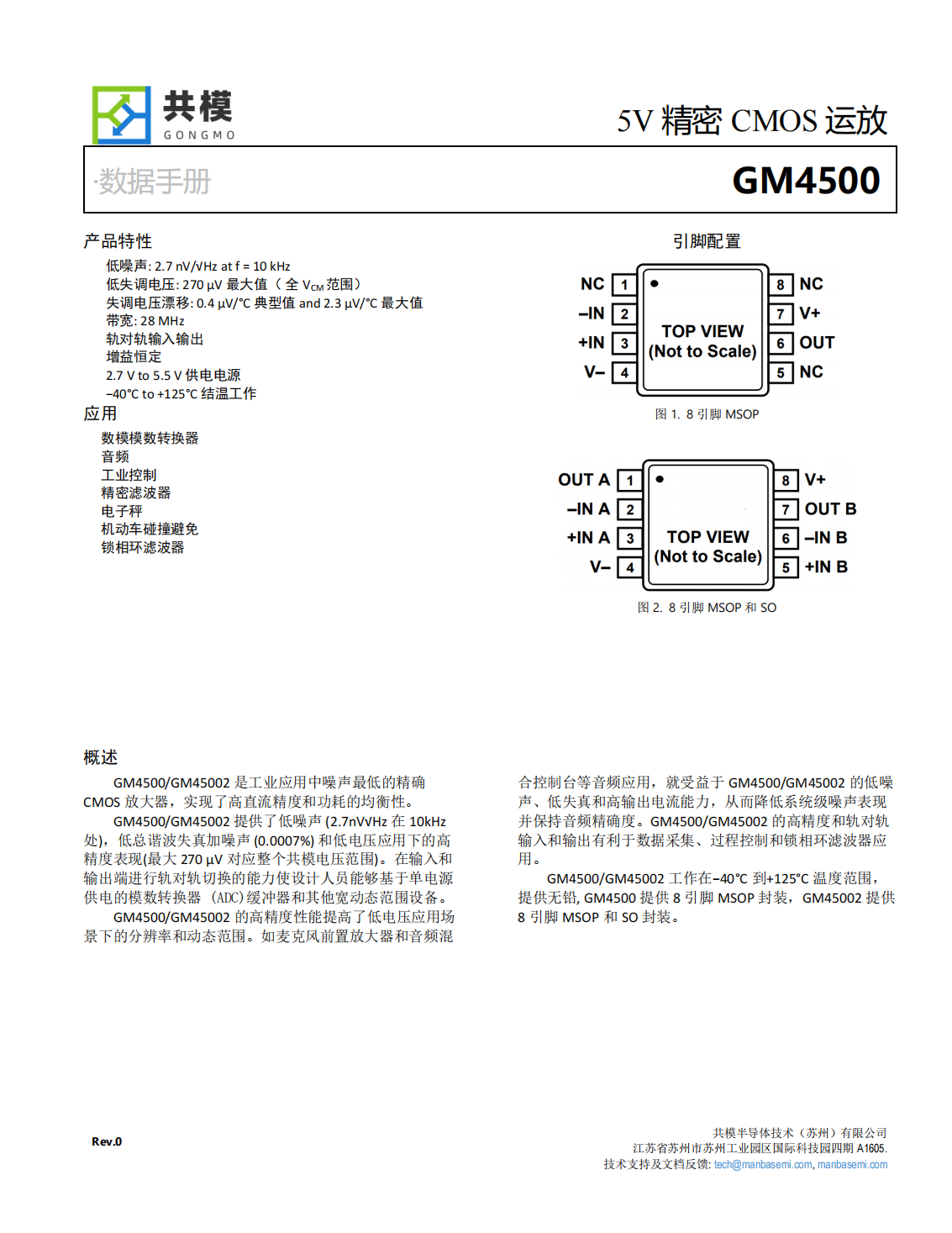 GM4500/GM45002工作在?40°C到+125°C溫度范圍,提供無(wú)鉛,GM4500提供8引腳MSOP封裝,GM45002提供8引腳MSOP和SO封裝。