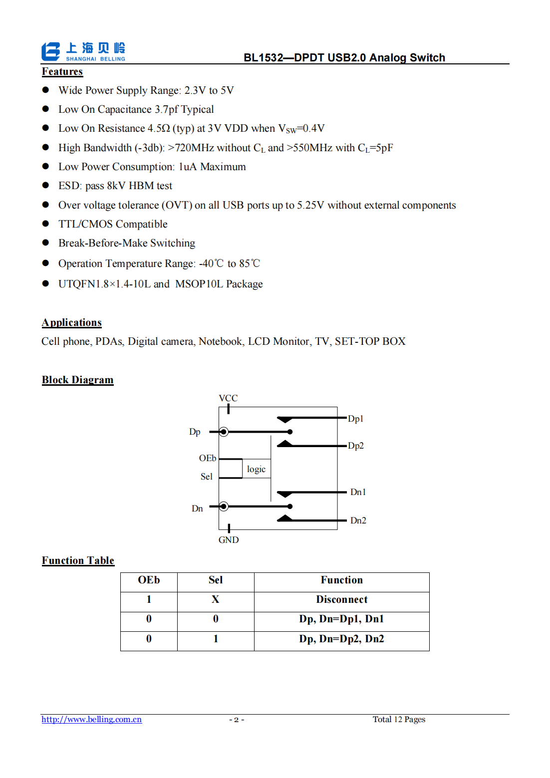 The BL1532 is a Low-Power,Two-Port,High-Speed,USB2.0(480Mbps)double–pole double-throw(DPDT)Analog Switch featuring an On-Resistance of 4.5 ohm at VCC=3V and a Low On Capacitance 3.7pf Typical.