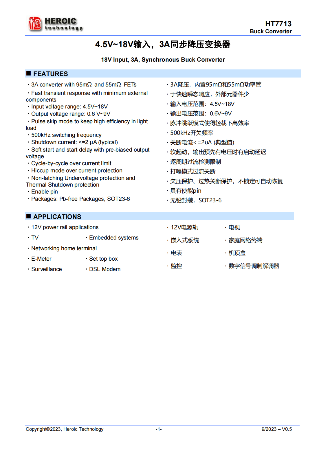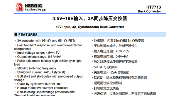 HT7713是一款3A降壓轉(zhuǎn)換器,具有最少的外部元件和低關(guān)斷電流。該器件具有快速瞬態(tài)響應(yīng)的特點(diǎn),輸出電容器采用低ESR(聚合物)或超低ESR(陶瓷),無(wú)需外部補(bǔ)償。該器件在輕載時(shí)以脈沖跳躍模式工作,達(dá)到高效。HT7713采用SOT23-6封裝。
