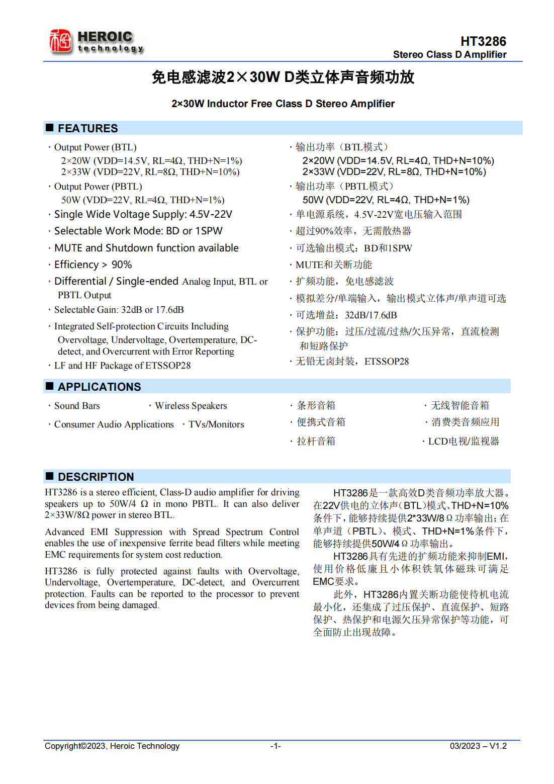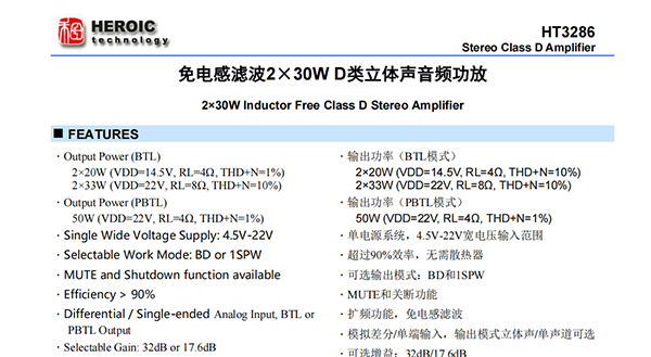 HT3286是一款高效D類音頻功率放大器。在22V供電的立體聲(BTL)模式、THD+N=10%條件下,能夠持續(xù)提供2*33W/8Ω功率輸出;在單聲道(PBTL)、模式、THD+N=1%條件下,能夠持續(xù)提供50W/4Ω功率輸出。HT3286具有先進的擴頻功能來抑制EMI,使用價格低廉且小體積鐵氧體磁珠可滿足EMC要求。此外,HT3286內(nèi)置關(guān)斷功能使待機電流最小化,還集成了過壓保護、直流保護、短路保護、熱保護和電源欠壓異常保護等功能,可全面防止出現(xiàn)故障。