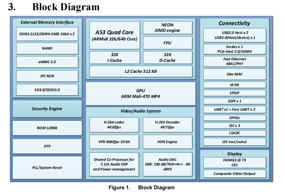 Boot-ROM和OTP(一次性可編程ROM)用于安全啟動和密鑰存儲,集成10/100以太網(wǎng)MAC和PHY和千兆以太網(wǎng)MAC,集成三重USB2.0高速支持OTG控制器和PHY,用于USB Type-C插座支持SDIO 3.0接口