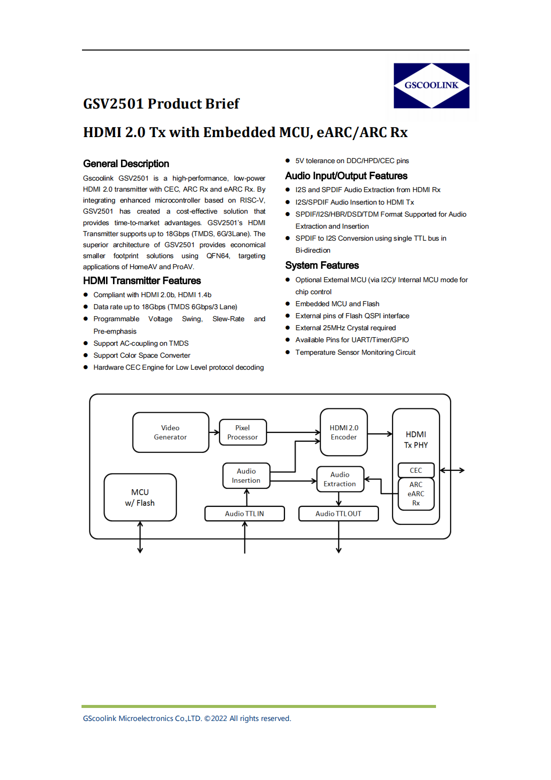 Gscoolink GSV2501 is a high-performance,low-power HDMI 2.0 transmitter with CEC,ARC Rx and eARC Rx.By integrating enhanced microcontroller based on RISC-V,GSV2501 has created a cost-effective solution that provides time-to-market advantages.GSV2501’s HDMI Transmitter supports up to 18Gbps(TMDS,6G/3Lane).The superior architecture of GSV2501 provides economical smaller footprint solutions using QFN64,targeting applications of HomeAV and ProAV.
