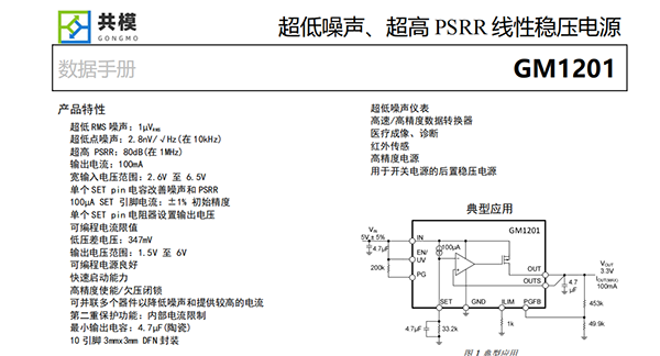 GM1201可在450mV典型壓差電壓條件下提供100mA。正常工作靜態(tài)電流的典型值為1.9mA,并在停機模式中低于1μA。該器件通過片外電阻調(diào)節(jié)輸出電壓,能夠在寬輸出電壓范圍(1.5V至6V)內(nèi)保持單位增益工作,從而提供幾乎恒定的輸出噪聲、PSRR、帶寬和負(fù)載調(diào)整率,并且這些性能與輸出電壓無關(guān)。此外,該穩(wěn)壓電源還擁有可編程電流限值、快速啟動和用于指示輸出電壓調(diào)節(jié)的可編程電源良好信號。