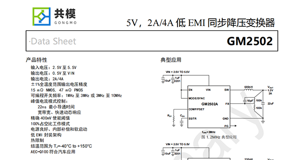 GM2502是一個非常小、高效、低噪音同步2A降壓直流/直流變換器,從2.5V到5.5V的輸入電源運(yùn)行。該變換器使用固定開關(guān)頻率,在1MHz到10MHz時進(jìn)行峰值電流模式控制,最小開關(guān)時間低至22ns,通過較小的外部組件實(shí)現(xiàn)快速瞬態(tài)響應(yīng)。低EMI封裝架構(gòu)可以最大限度地減少EMI排放。