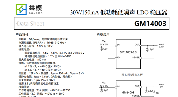 GM14003穩(wěn)壓器輸出噪聲為30μVRMS,與5V及以下的固定選項輸出電壓無關。
