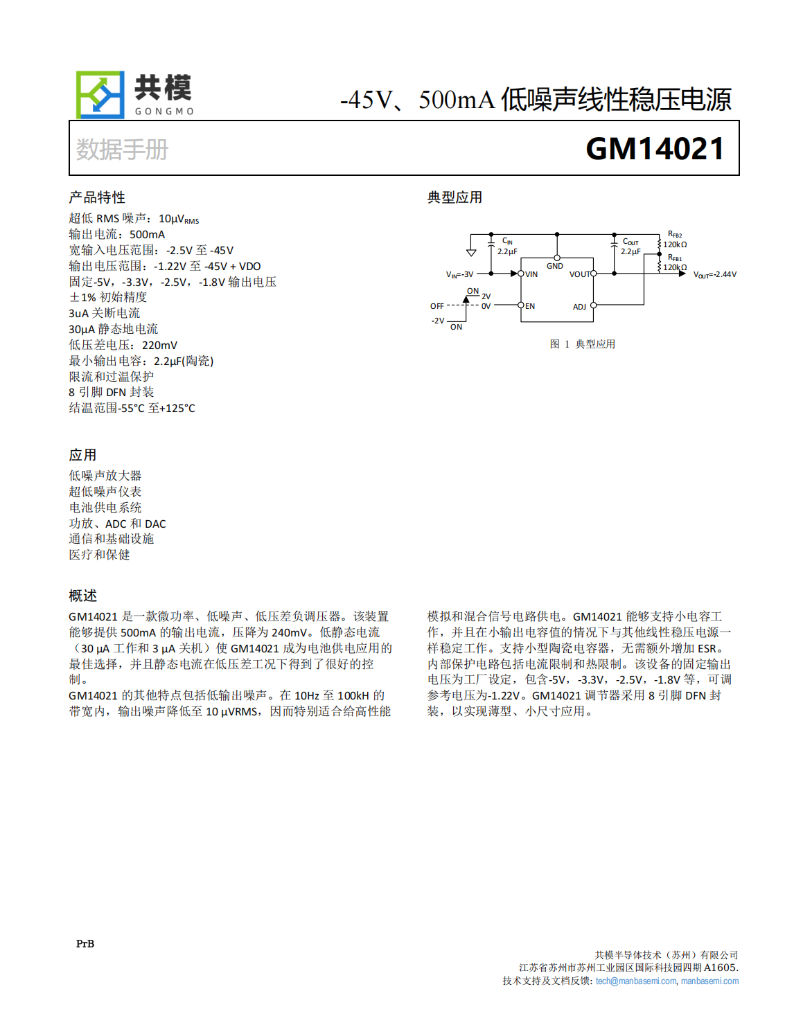 內(nèi)部保護(hù)電路包括電流限制和熱限制。該設(shè)備的固定輸出電壓為工廠設(shè)定,包含-5V,-3.3V,-2.5V,-1.8V等,可調(diào)參考電壓為-1.22V。GM14021調(diào)節(jié)器采用8引腳DFN封裝,以實(shí)現(xiàn)薄型、小尺寸應(yīng)用。