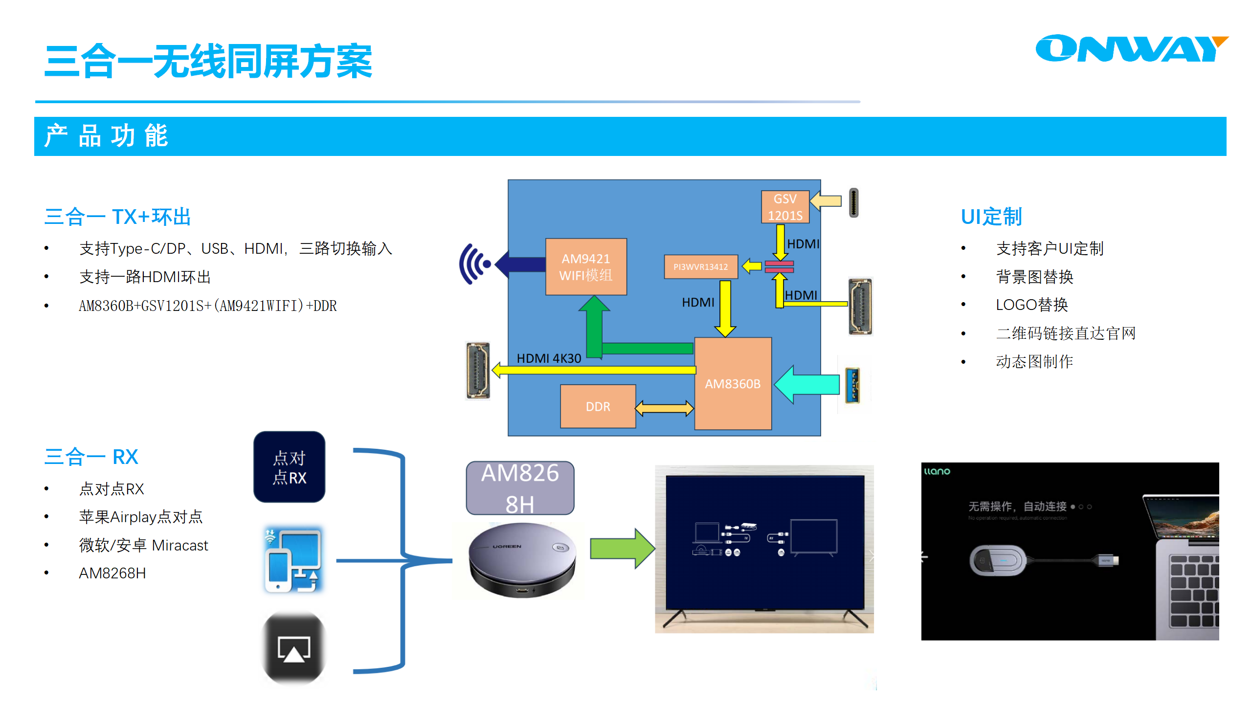 AM8268H是炬力北方微電子推出的一款無(wú)線視頻三合一芯,AM8268H既可以做為無(wú)線視頻點(diǎn)對(duì)點(diǎn)的RX使用,也可以單獨(dú)連接手機(jī)的自有協(xié)議,蘋(píng)果手機(jī)的Airpaly和安卓手機(jī)的Miracast,使得低端手機(jī)(2000元以下手機(jī))或者老款手機(jī)(iPhone14以前的手機(jī))在不支持Type-C/DP視頻輸出的時(shí)候,也可以通過(guò)無(wú)線視頻投屏到電視上而且AM8268H支持雙頻5.8G+2.4G,信號(hào)更穩(wěn)定。