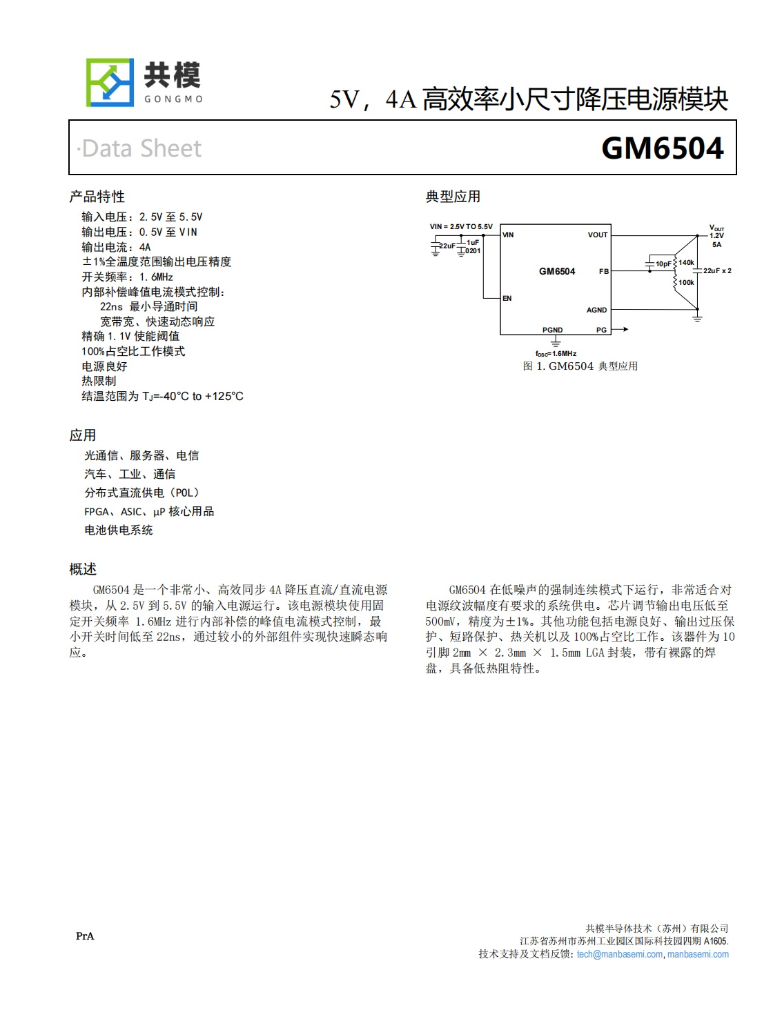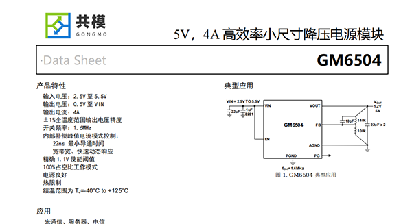 GM6504是一個非常小、高效同步4A降壓直流/直流電源模塊,從2.5V到5.5V的輸入電源運(yùn)行。該電源模塊使用固定開關(guān)頻率1.6MHz進(jìn)行內(nèi)部補(bǔ)償?shù)姆逯惦娏髂J娇刂?,最小開關(guān)時間低至22ns,通過較小的外部組件實(shí)現(xiàn)快速瞬態(tài)響應(yīng)。