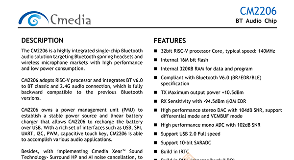 CM2206是一款高度集成的單片藍牙芯片,針對藍牙游戲耳機的音頻解決方案